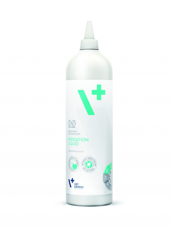 Irrigation Liquid es una solución limpiadora y aclarante para el tratamiento de abrasiones, laceraciones y heridas en perros y gatos. Prepara la zona para procedimientos médicos posteriores.