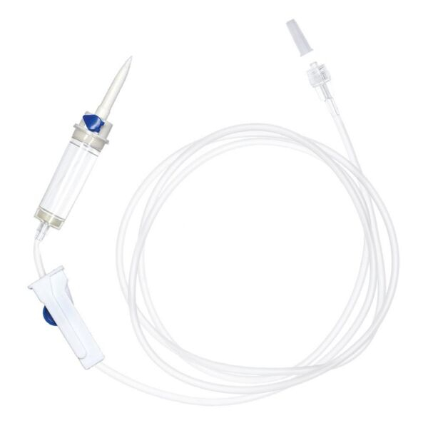 Equipo de infusión universal con toma de aire. Por gravedad. Exento de látex, de un solo uso. Envase individual.