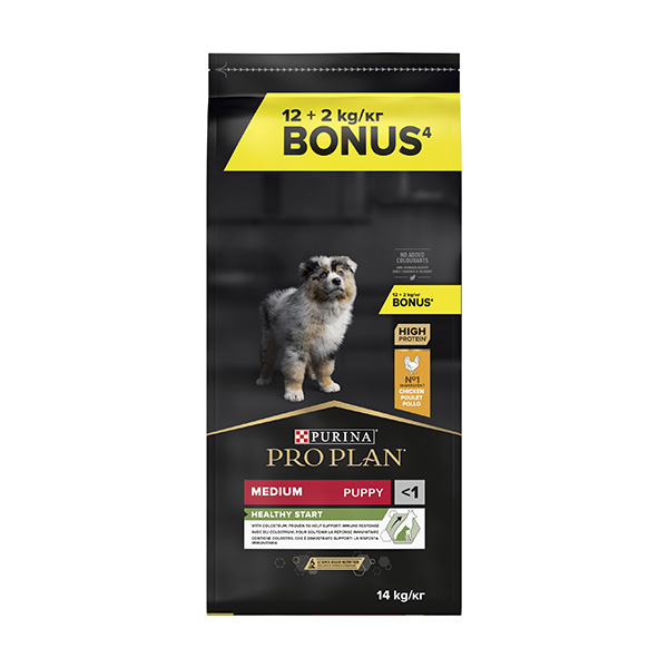PURINA PRO PLAN Puppy Medium Healthy Start rico en Pollo es un alimento completo para cachorros de razas medianas, rico en pollo. También es adecuado para perras gestantes / lactantes. Contiene calostro, que se ha demostrado que apoya a la respuesta inmunitaria.ite de pescado, Huevo deshidratado, Calostro deshidratado (0,1%).
