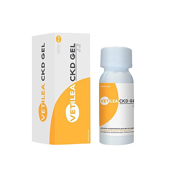 Vetilea CKD Gel es un alimento complementario para perros y gatos que contiene Carbonato Cálcico, vitamina B3 y quitosano para el equilibrio del sistema renal.