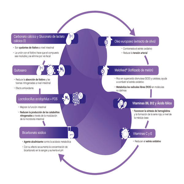 Complemento nutricional especialmente formulado para ayudar a una correcta función renal de perros y gatos. Puede administrarse de manera continuada en animales que tengan Enfermedad Renal Crónica, Su exclusiva fórmula contiene diferentes ingredientes que actúan de manera sinérgica para ayudar a la correcta función renal.