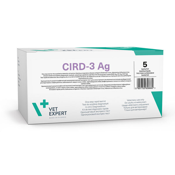 Detecta los antígenos del virus del moquillo canino, adenovirus y el virus de influenza canino. Sensibilidad: CDV Ag 98,8%, CAV Ag 94,0%, CIV 90,0% / Especificación: CDV Ag 99,9%, CAV Ag 97,0%, CIV 99,9%