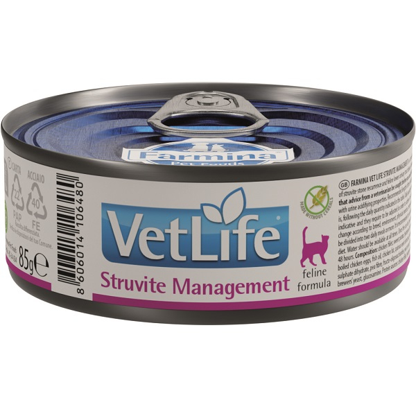 Farmina Vet Life Struvite Management es un alimento dietético completo para gatos que reduce la recurrencia de cálculos de estruvita y la enfermedad del tracto urinario inferior.